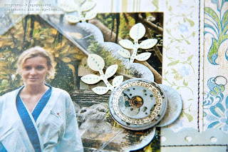 - натирки "Wildheart", стразы и бусины, бабочку из набора "Мадлен" K&Company, акриловую скобочку из набора высечек Tabbed Book; фишку из набора "Часовые механизмы", высечки "Памятные вещички";