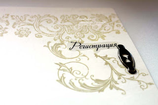 Натирки из набора так подходят к этой бумаге, что и не отличить, где заканчивается рисунок бумаги и где начинается натирка. Так, например, возле слова «регистрация», завитушка – это натирка. Также для украшения этих страниц я использовала бархатную ленту, металлическое украшение в виде замочной скважины, кругленькие брадсы и брадсы-сердечки, фишку из набора «Королевские атрибуты», кружево и одну букву алфавита из свадебного набора. Я взяла букву «О», покрыла её прозрачным эмбоссингом и сделала из неё рамочку, в которой красуется брад-сердечко и цветочек."