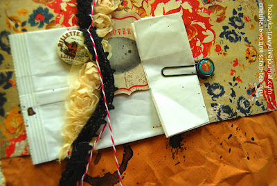На первом развороте использован скотч с принтом Точки, крафт-бумага в качестве основы, штамп от Scrapbookshop, акриловая краска (ей выбелены края), кусочек чипборда Циферблаты, мини-фишка, шебби-лента. Потеки сделаны чернилами с аппликатором Distress Stains от Ranger.